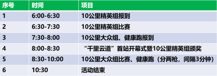 3、10公里大众组比赛将在开幕式后第一枪起跑(第二枪3.5公里健康跑)。