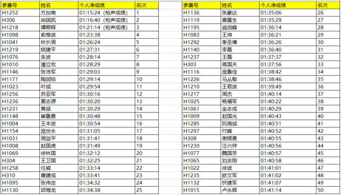 半程马拉松男子前50名: