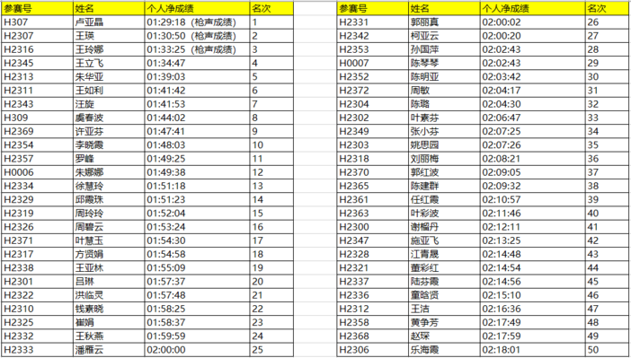 半程马拉松女子前50名: