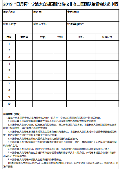 团队组快递领物为整个团队参赛包一次性快递,因时间、人力关系,不接受团队个别队员及个人组报名选手快递申请,不接受老三区团队、个人快递申请。