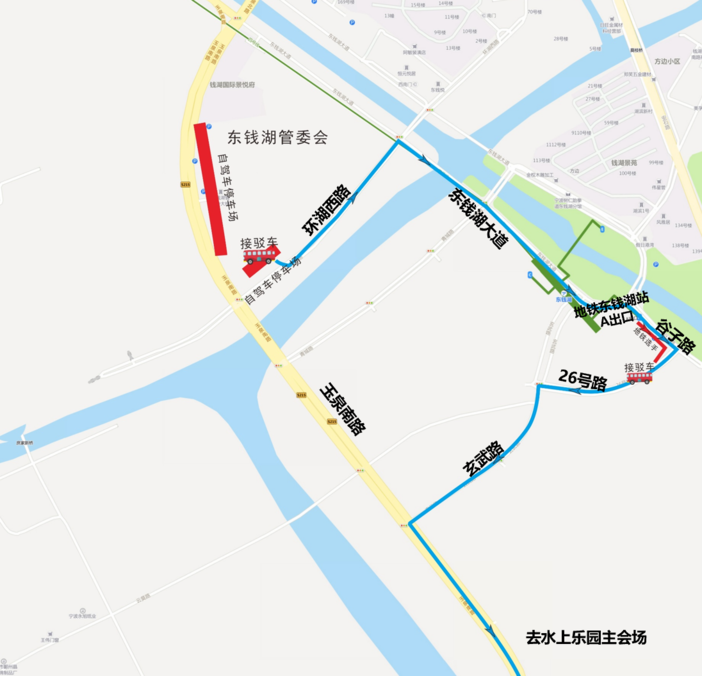 选手自驾车指定停车区为玉泉南路东钱湖管委会外来车辆停车场,选手停车后,停车场东面将有接驳车接驳至水上乐园公交站。
